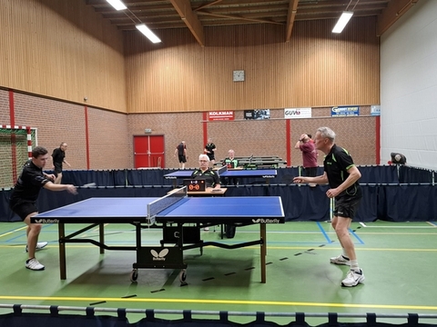 De wedstrijden tegen Bredevoort begonnen stroef en voordat we het wisten stonden we met 0-3 achter, de dubbel kwam mooi op tijd om er 1-3 van te maken. De volgende drie wedstrijden wonnen wij er 2, Marco verloor nipt in 5 games (11-13) waardoor het 3-4 werd. Ook op 3 opvolgende partijen wonnen we er weer 2 en verloor André in 5 games. De eindstand 5-5 toch tevreden want we houden 8 punten voorsprong op Bredevoort en het onderling resultaat is beter.