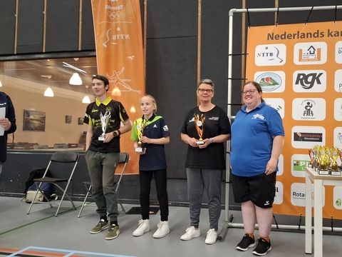 Angelien speelde met Lucas van Doing uit Zoetermeer. Een goed koppel zo bleek want zonder 1 keer samen gespeeld te hebben en geen game te verliezen zijn ze terecht Nederlands Kampioen.